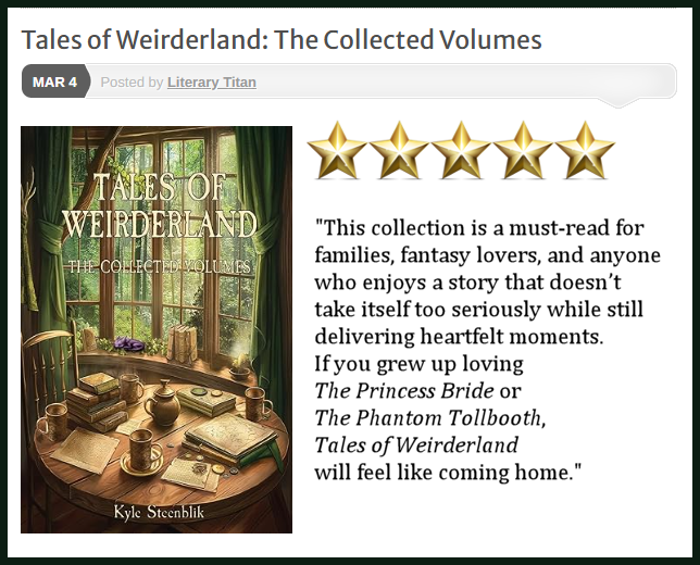 “What surprised me most was the book's emotional depth. Though it starts as a fun, lighthearted read, the second trilogy carries a weightier message. Steenblik wrote these stories as a reflection of his children's growth, and it shows... This collection is a must-read for families, fantasy lovers, and anyone who enjoys a story that doesn't take itself too seriously while still delivering heartfelt moments. If you grew up loving The Princess Bride or The Phantom Tollbooth, Tales of Weirderland will feel like coming home” — Literary Titan